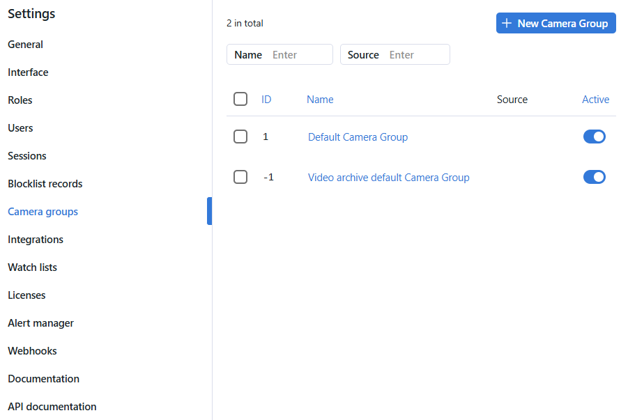 Camera groups are entities that are used for video sources classification. After processing a video, the system will attribute the object recognition events obtained from the video to a designated camera group. It makes further event handling and search a lot easier.