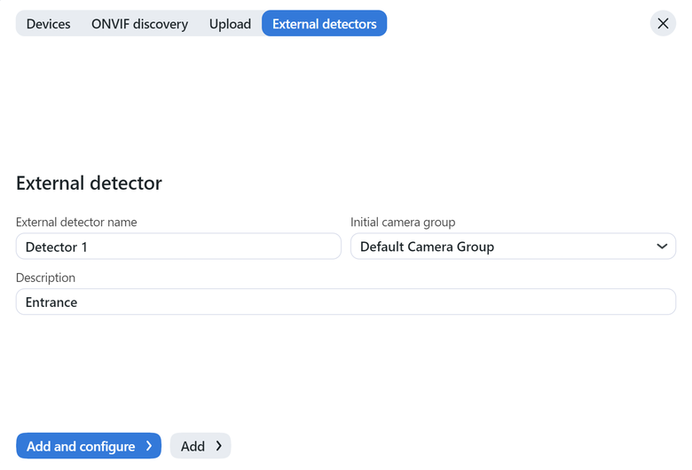 In the opened tab, specify the external detector name and description. Add the external detector to a camera group, so it will be more convenient to filter events from this device later.