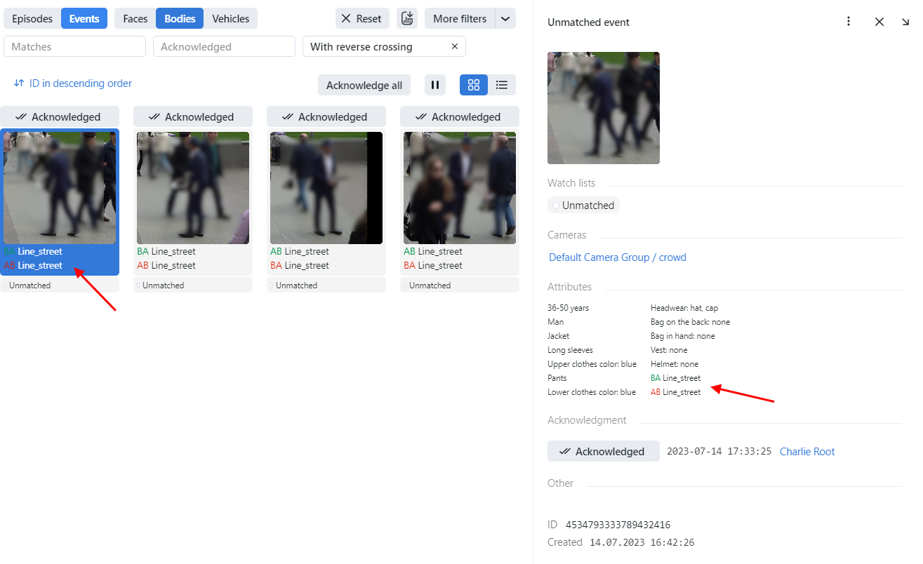 You can navigate directly to the Events tab by clicking three dots → Filter face events/Filter body events/Filter vehicle events on the list of lines.