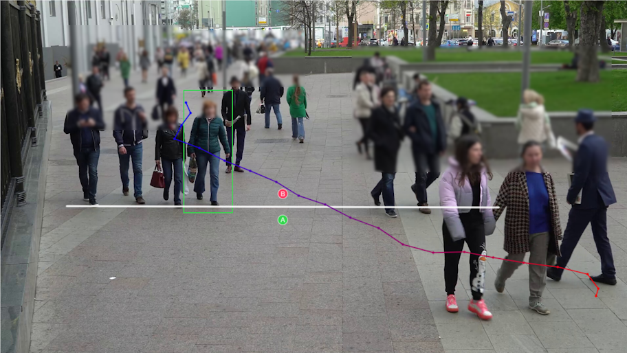 On the full frame of an episode with a line crossing, the best event of an episode with the bbox of an object is displayed, and the line with the track is displayed from the event that had a crossing. The blue color shows the beginning of the track, and the red color shows the end of the track. If there are several events with crossing in the episode, the line and track will be displayed from the first event with crossing in the episode.