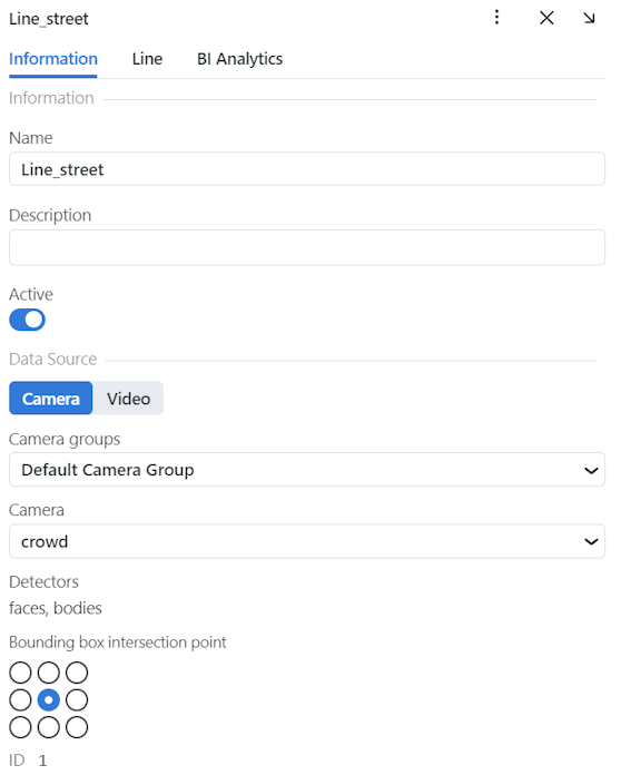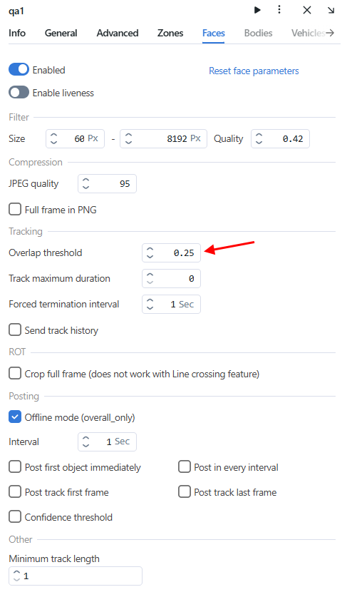 If there are a lot of objects in the video stream, and they begin to overlap each other periodically, which is why some line crossings may not be fixed, then you can increase the value of Overlap threshold in the camera settings for the desired detector.