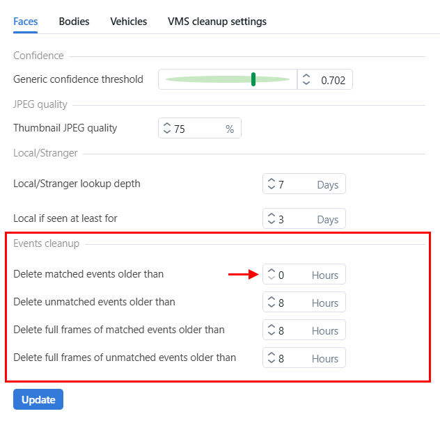 To delete all events for a specific parameter, set its Hours value to 0 (zero). The system will then remove events as scheduled by the CLEANUP_SCHEDULE parameter within the /opt/findface-multi/configs/findface-multi-legacy/findface-multi-legacy.py configuration file.