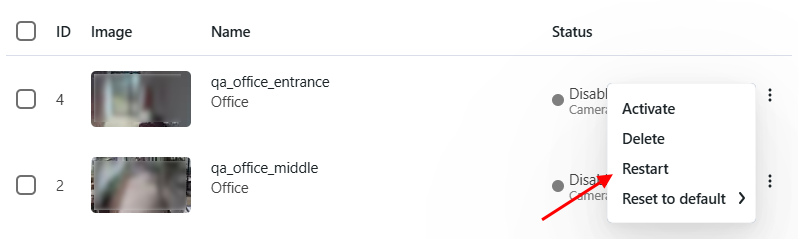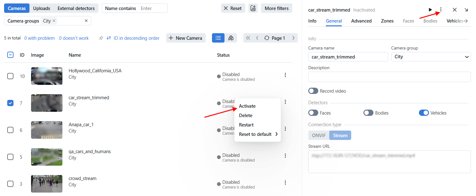 On the list of cameras or on the processing configuration wizard, click three dots → Activate to activate camera and start object identification. Make sure that the camera group is active. You can view object identification events on the Events and Episodes tabs by filtering the list of events by the camera group/camera.