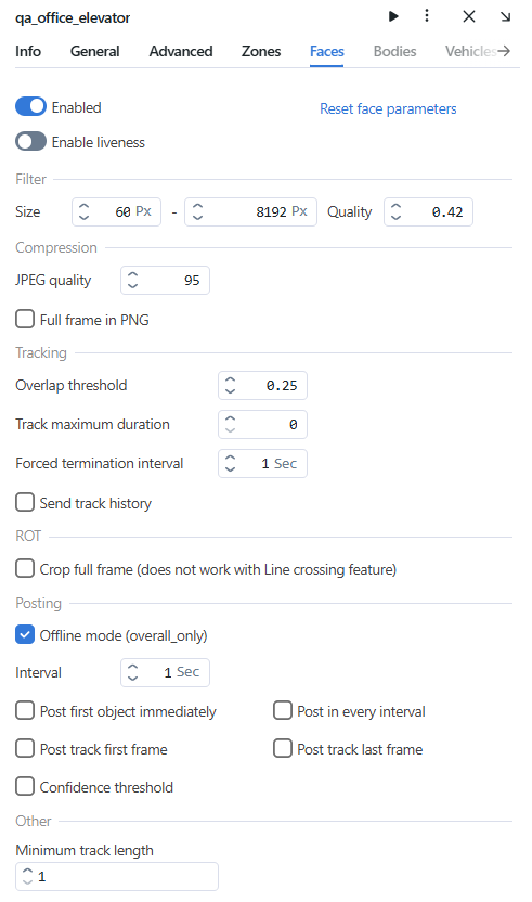 Offline mode (overall_only): By default, the system uses the offline mode to process the video, i.e., it posts one snapshot of the best quality per track to save disk space. Disable it to receive more face snapshots if needed. If the offline mode is on, the parameters of the real-time mode are off.