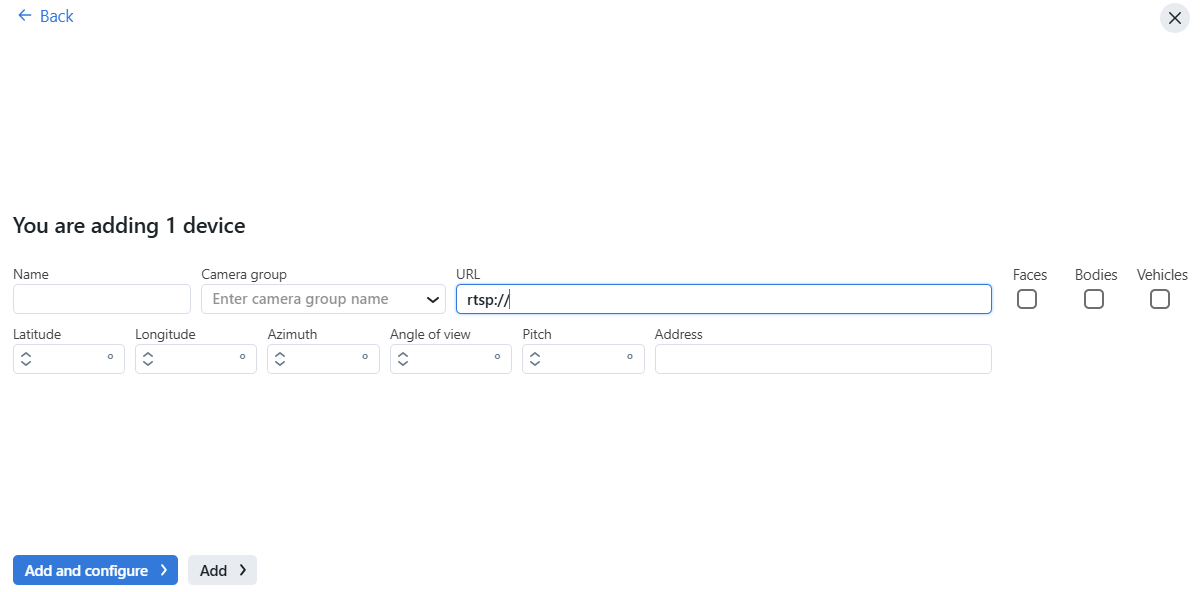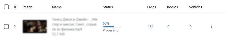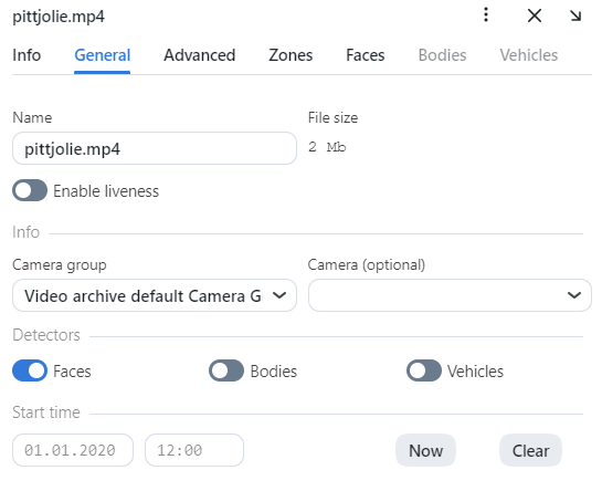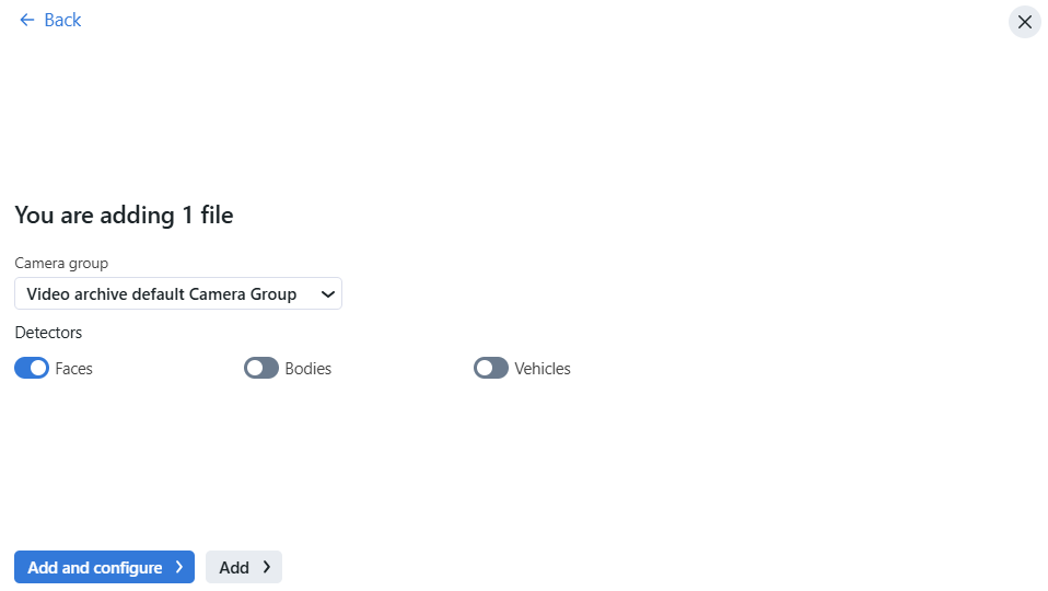Video archive default Camera Groupis perfect for this task. You can also create a new camera group with basic settings specifically for this video file. Select detectors that you want to enable on this video: faces, bodies, vehicles.Click the video on the list to open the processing configuration wizard. Specify parameters of video processing in the same way as for cameras.