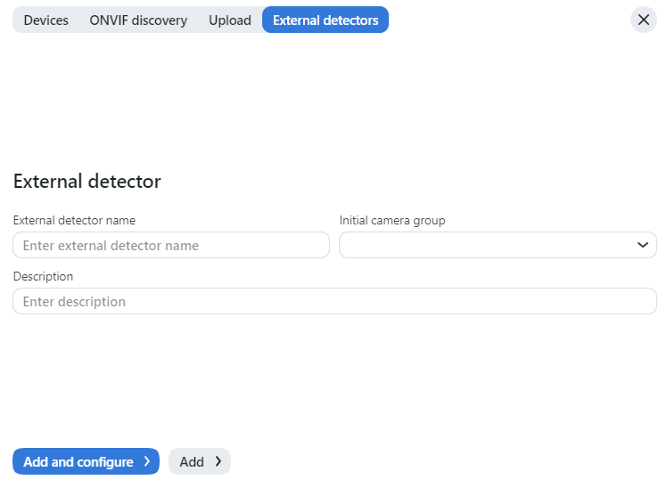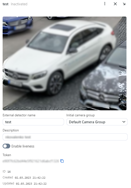 If necessary, change the External detector name. Specify the Initial camera group and Description, enable liveness.