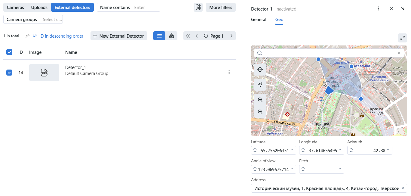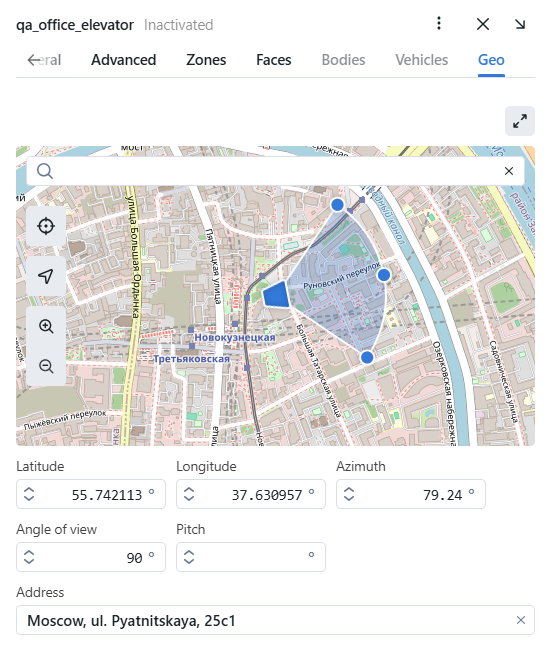 (Optional) On the Geo tab, specify the camera geographical location. The map option is enabled by default. Synchronization of the camera location on the map and the data in the camera address is supported. If necessary, you can move the camera on the map and if the address field is empty, the new address will be automatically entered into the address field. If the address field was previously filled in, then no changes will occur. Follow this instruction Configure Maps to configure maps functionality.