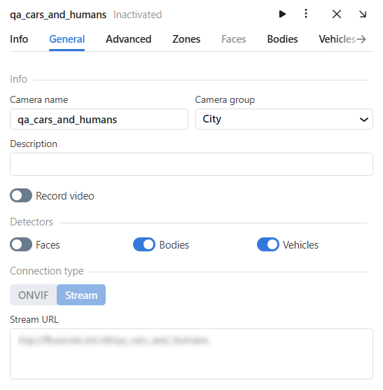 On the General tab, you can change Camera Name, Camera group, or add Description. You can enable video recording if this option is enabled. Select detectors that you want to enable on this camera: faces, bodies, vehicles.