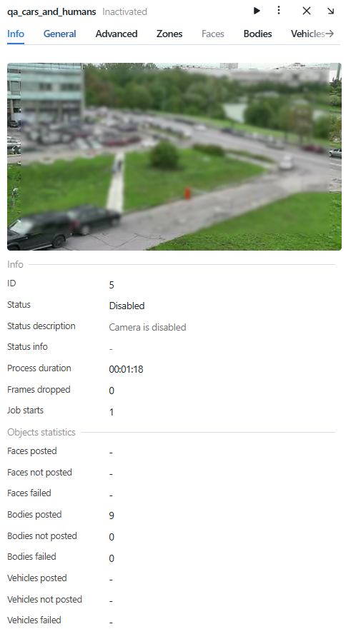 For each camera, you will be provided with complete statistics, including its current status, description, the duration of the current session, the number of successfully posted objects, the number of objects processed with errors after the last job restart, the number of frame drops, and other data. To consult this data, click the camera and go to the Info tab.