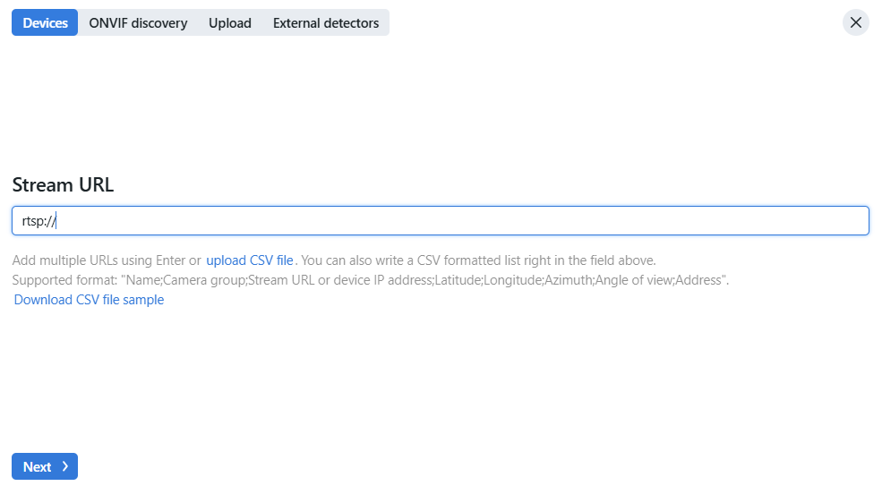 With a large number of cameras, you can add multiple URLs using CSV formatted list with filled fields of camera data.