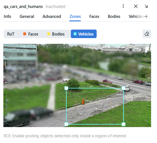 ROI: the region of interest enables detecting and posting to the server objects found within its boundaries at least once. The object’s subsequent movements are tracked and post until it leaves the monitoring area or ROT. A separate ROI is used for each type of object (face, bodies, vehicle), which allows you to set up to 3 areas per camera.