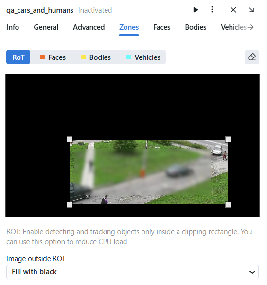 On the Zones tab, specify the region of tracking RoT within the camera field and region of interest (ROI) to activated detectors, if needed. To cancel the selection area, click