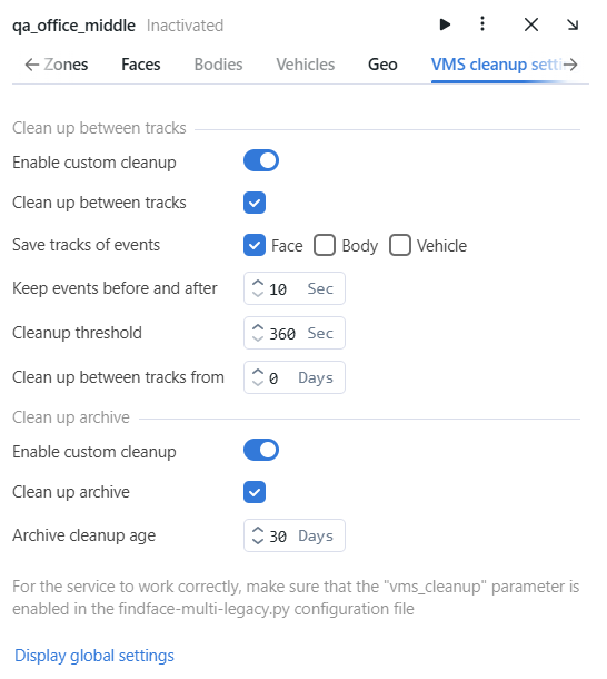 On the VMS cleanup settings tab, you can configure custom settings for a single camera. Follow this instruction Enable VMS Cleanup Settings to enable VMS cleanup service.