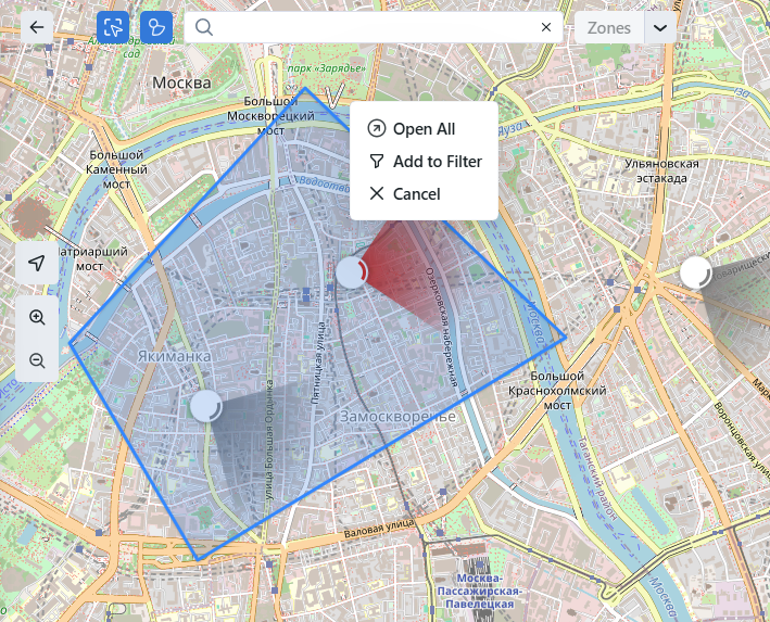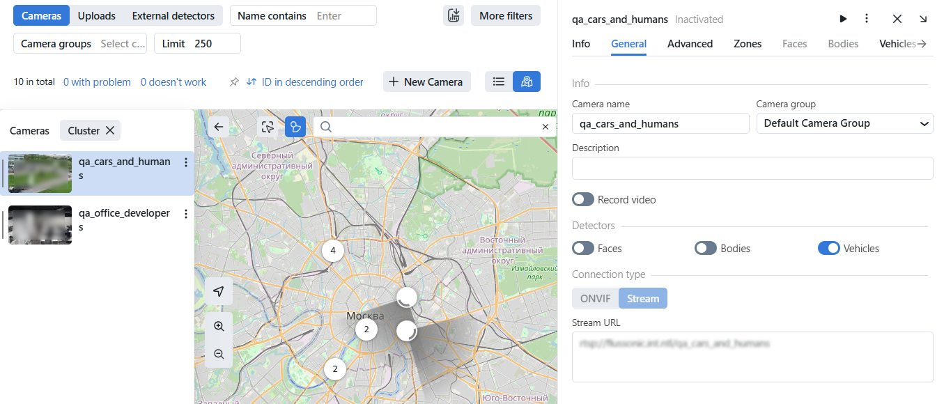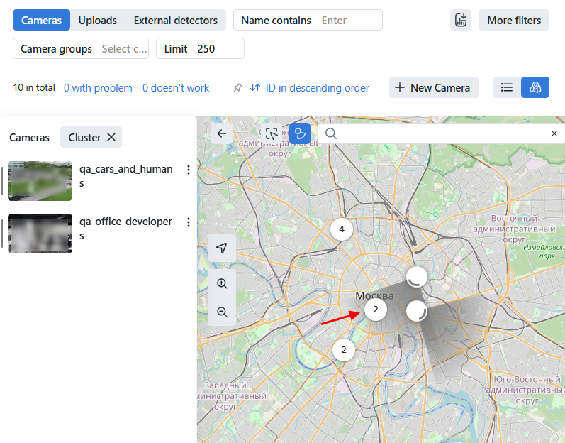 to switch to map view. Cameras are grouped into clusters at a distance, and when approaching, the cluster is divided into separate objects.