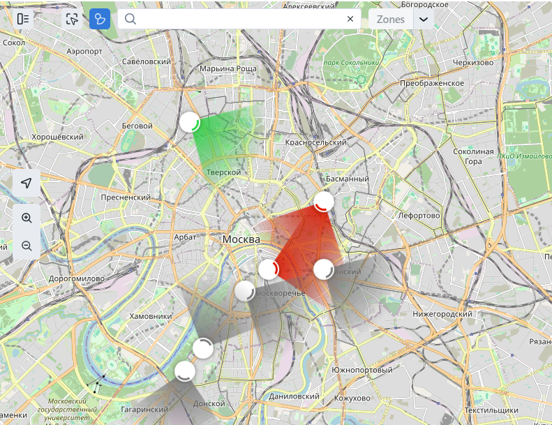 Cameras are displayed on the map with their statuses (green, yellow, red, gray), so you can quickly assess the working condition of the cameras, as well as their connection to the video surveillance system.