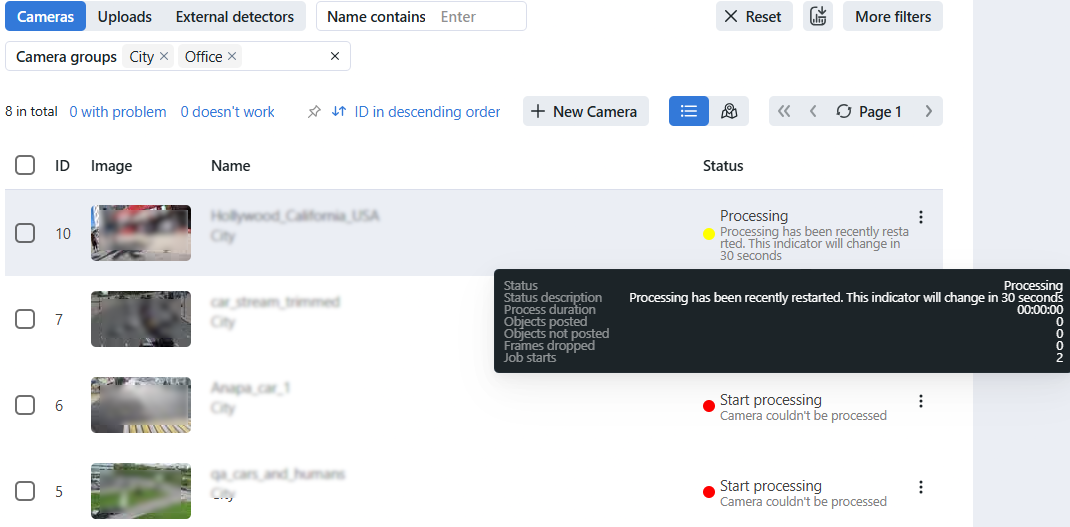 Cameras on the list can be sorted by ID in ascending or descending order. You can also apply quick filters to show cameras with failure working statuses (Yellow and Red statuses). When you hover the mouse over the camera status, detailed error information is displayed.