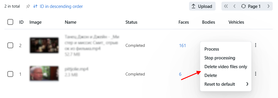 If you need to free disk space, but keep recognized objects, you can Delete video files only. To delete an uploaded file completely, select Delete.