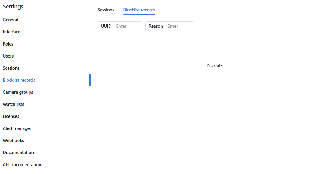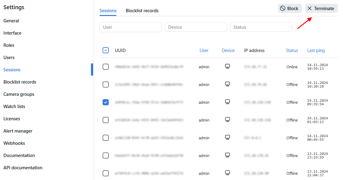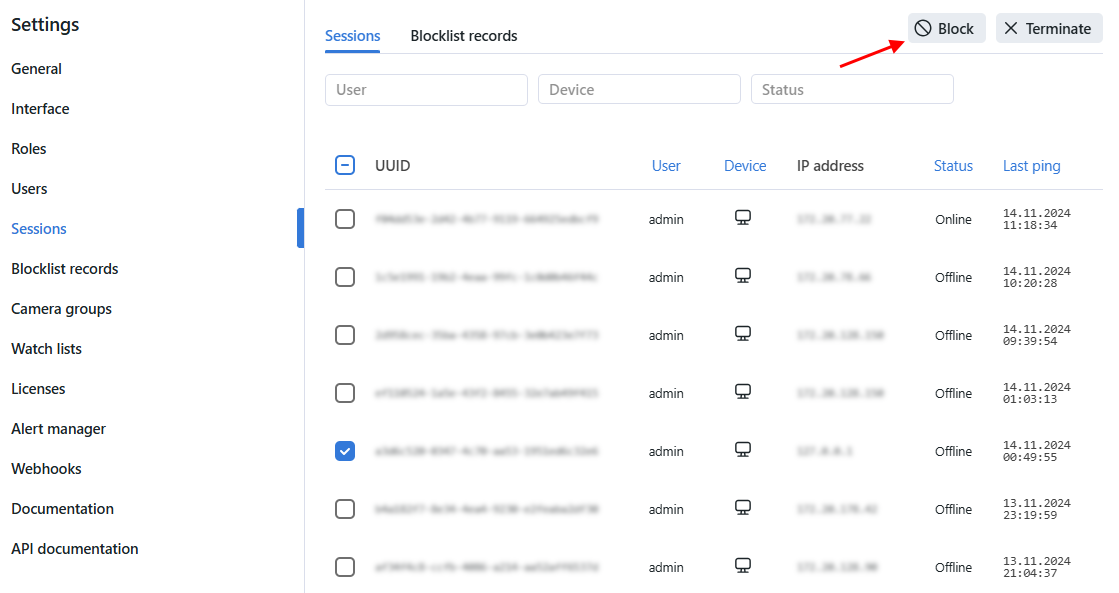 You can add a device to the blocklist on the Sessions tab. Blocking a device leads to the user’s automatic log-out.
