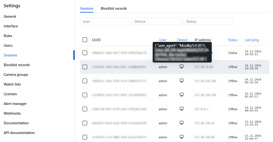 FindFace Multi allows you to monitor user sessions and learn associated data, such as the connected device UUID, type of user interface, IP address, last ping time, and so on.