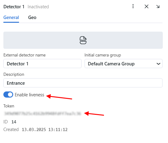 Click Add and configure. On the General tab, enable liveness if required. If you have chosen to enable liveness on external detectors, it is recommended to configure the neural network model, used for liveness recognition. As frames from external detectors are processed by the