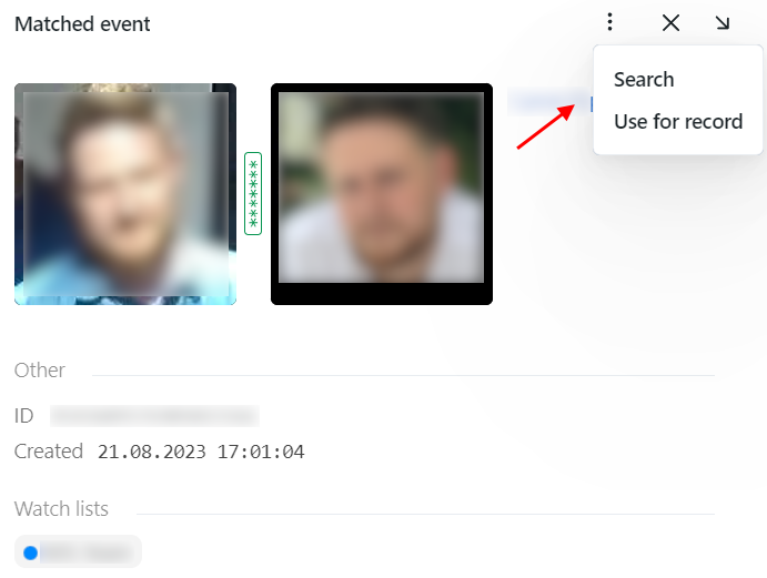 In the detailed event view click on Use for record. If a detected object has a match in the record index, you will be able to either create a new record from the event or add a photo of a detected object to an existing record.