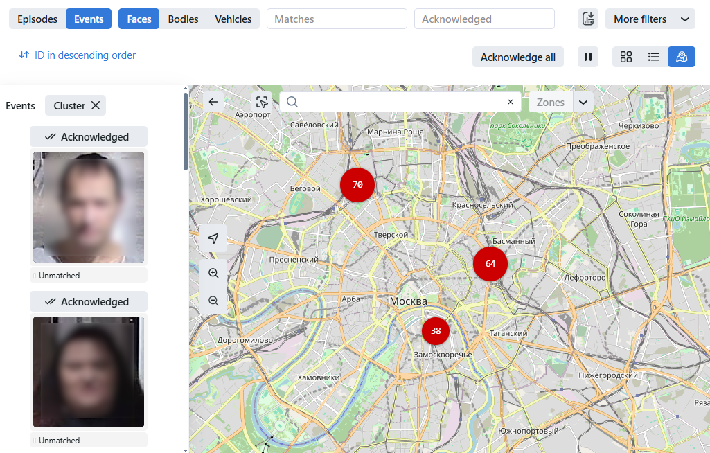 to switch to the map view. Events/episodes are displayed on the map as red circles with the number of events/episodes inside. At a distance, events/episodes are grouped into clusters, and upon approaching, the cluster is divided into separate objects.