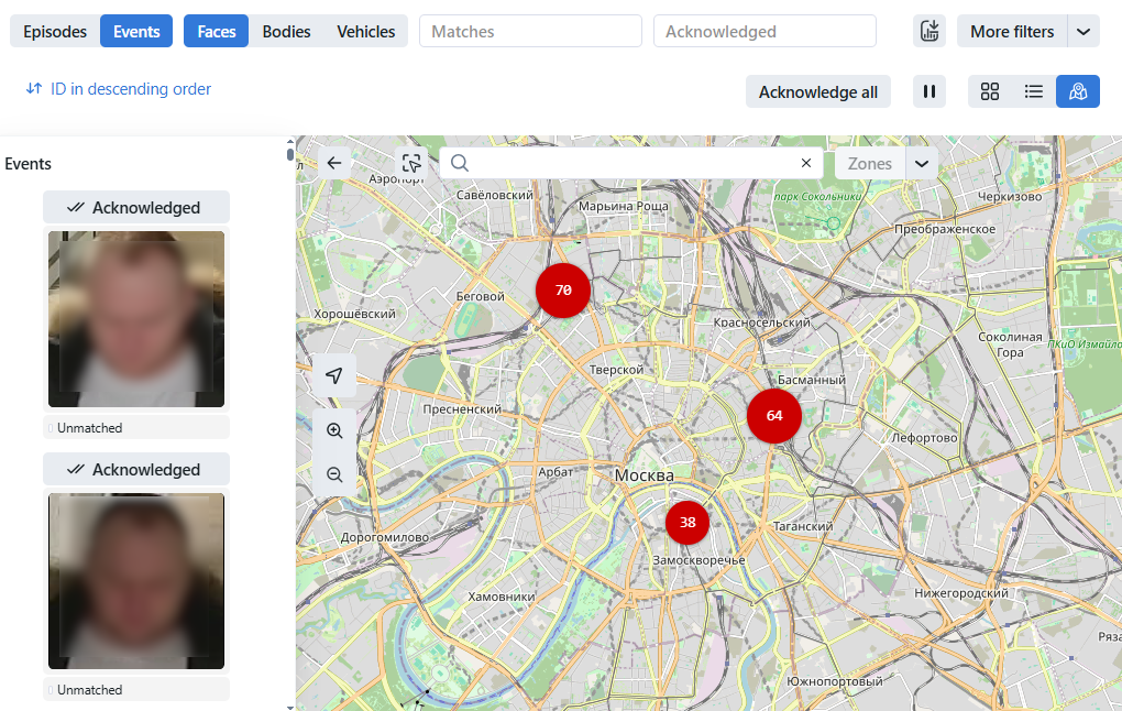 When the map functionality is enabled, events and episodes from cameras with a filled GEO field are displayed on the map.