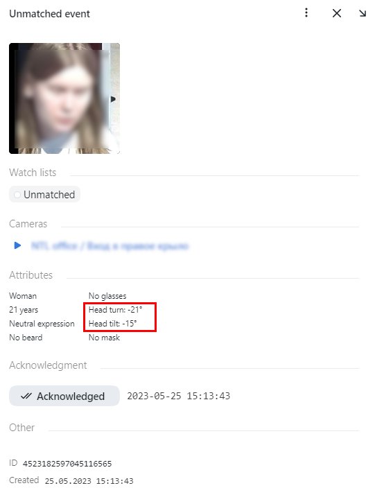 Analytics of shopping center visitors: reduce the number of created low-quality face clusters. When a face cluster is forming, events corresponding to the specified values of the head rotation angles are taken into account. See more for clusters.