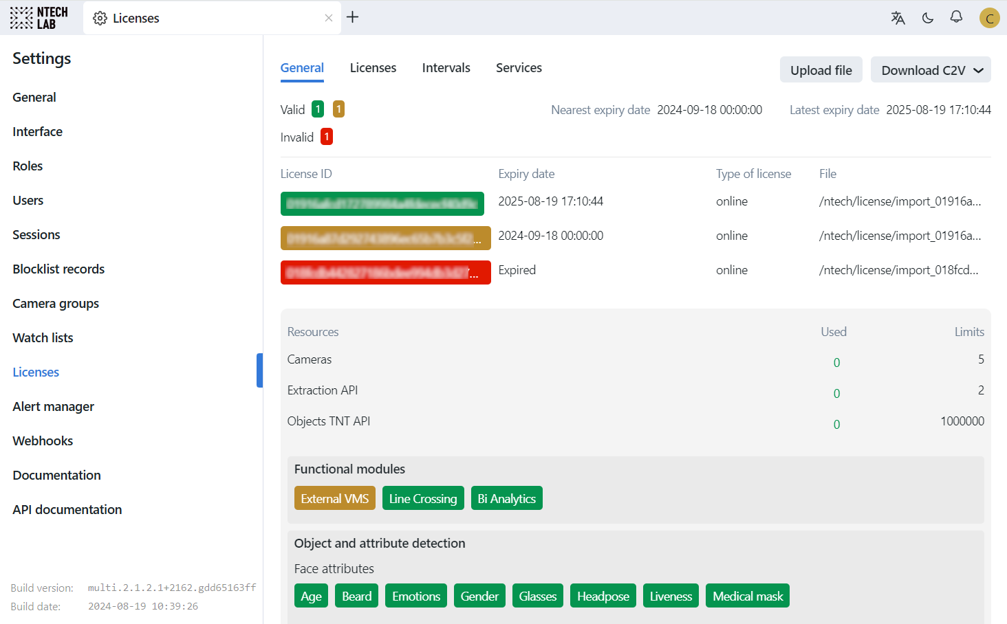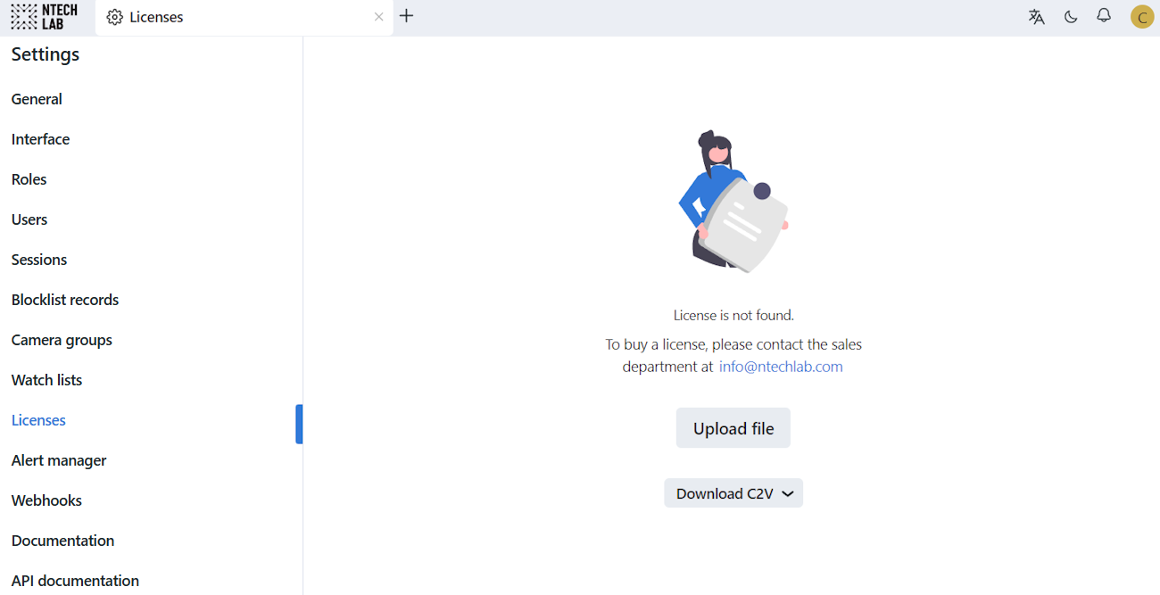 After installing FindFace Multi, upload the license file you obtained from your manager or the support service (support@ntechlab.com) into the system. To do so, navigate to Settings → Licenses.