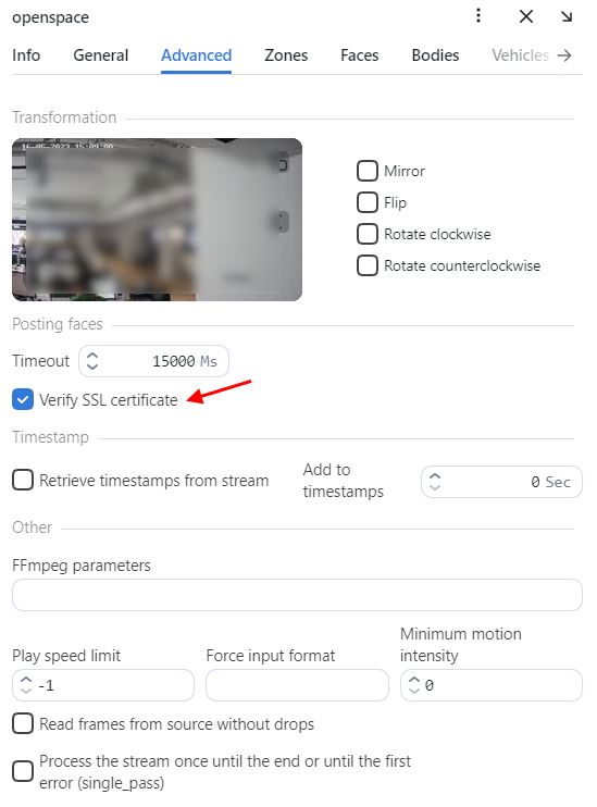 findface-video-workercontainer and is specified in theROUTER_URLvalue in the/opt/findface-multi/configs/findface-multi-legacy/findface-multi-legacy.pyconfiguration file.Verify the SSL certificate setting is disabled in the camera and video archive settings.
