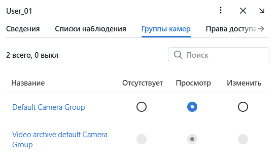 для определенной группы камер на вкладке Группы камер, пользователи с соответствующей ролью не смогут работать с данной группой камер. Снятие всех флажков для сущностиcameragroup