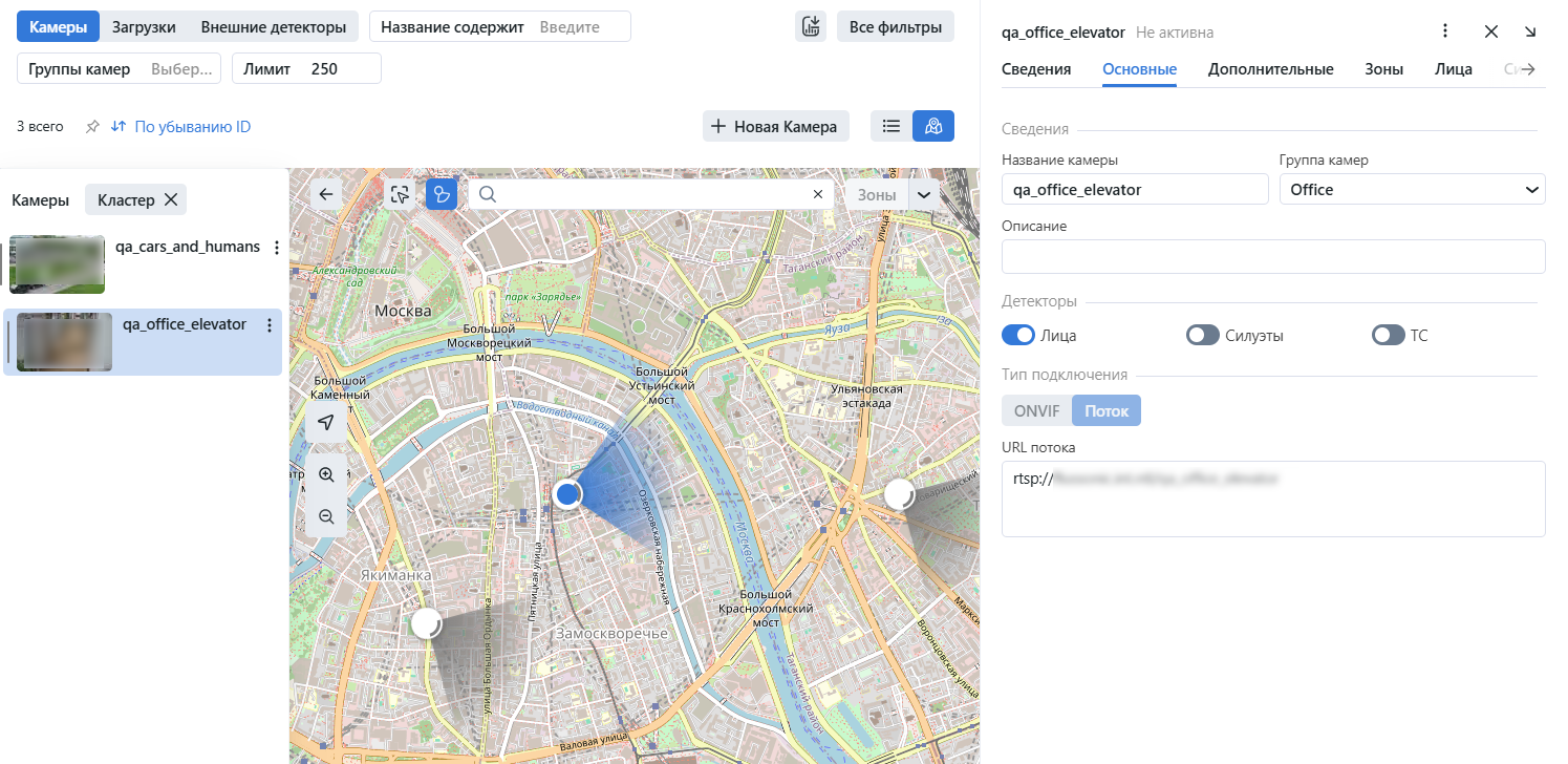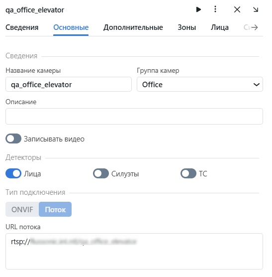 На вкладке Основные вы можете изменить название камеры, группу камер и описание. Вы можете записать видео, если эта опция включена. Поставьте флажки для тех детекторов, которые нужно активировать для данной камеры: лица, силуэты, транспортные средства.
