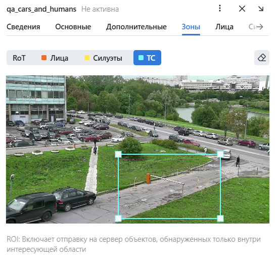 ROI: область интереса позволяет детектировать и отправлять на сервер объекты, обнаруженные в ее пределах по крайней мере, один раз. Последующие перемещения объекта будут детектироваться и отправляться до тех пор, пока объект не покинет область наблюдения или ROT. Для каждого типа объекта (лицо, силуэт, транспортное средство) используется отдельная ROI, что позволяет настроить до 3 областей на камеру.
