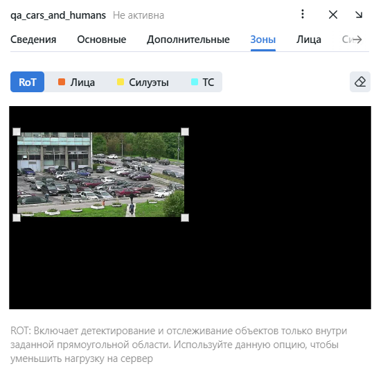 RoT: область обнаружения и отслеживания объектов (лиц/силуэтов и транспортных средств) внутри заданного прямоугольника. За пределами ROT детектирование объектов не производится. Используйте данную опцию, чтобы уменьшить нагрузку на видеодетектор объектов.