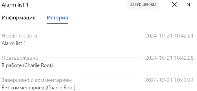 На вкладке История отображается следующая информация: название тревоги, к которой относится данное тревожное событие; дата и время создания тревожного события; информация о том, кто и когда подтвердил/отклонил тревогу, а также кто и когда завершил тревогу.
