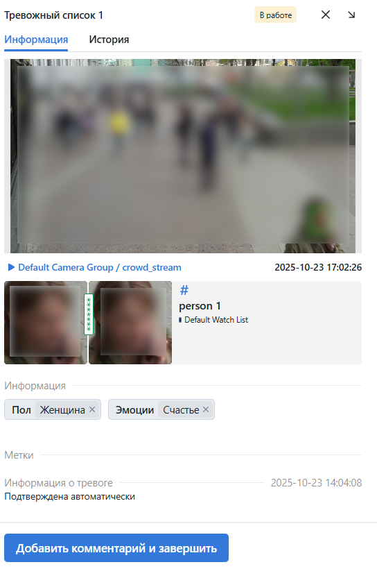 При нажатии на тревогу откроется боковая панель тревоги. Вид боковой панели тревоги может отличаться в зависимости от источника тревоги. Для тревог, источником которых является FindFace Multi, на вкладке Информация боковой панели отобразится статус тревоги, полный кадр изображения события, миниатюра, линия с траекторией (если настроено), название группы камер/название камеры, дата и время обнаружения, кнопка просмотра видео камеры (если включена запись), метки (если были заданы). В боковой панели отобразится совпадение объекта с объектом картотеки, в случае если таковое имеется, и будет указана вероятность совпадения. Вы также увидите набор условий, при соответствии которым произошло срабатывание системы. На вкладке Информация вы можете Добавить комментарий и завершить свою работу с тревогой.