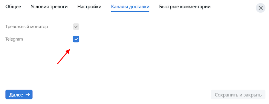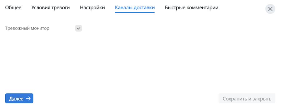 На следующей вкладке выберите Каналы доставки, в которые вы хотите получать уведомления. Канал доставки Тревожный монитор подразумевает отправку уведомлений в Тревожный монитор и Журнал тревог. Эта настройка включена по умолчанию и не подлежит изменению.