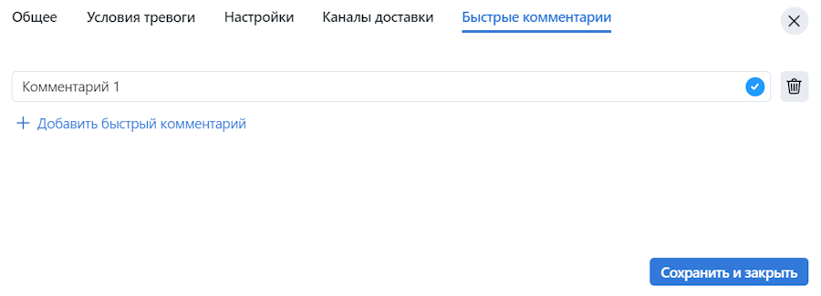 На вкладке Быстрые комментарии создайте комментарий для тревоги (при необходимости). Эти комментарии используются для завершения работы с тревогой в Журнале тревог и относятся к конкретной тревоге. Комментарии, созданные на этой вкладке, добавятся к комментариям по умолчанию (общим для всех тревог), которые уже хранятся в системе. Подробнее см. здесь.