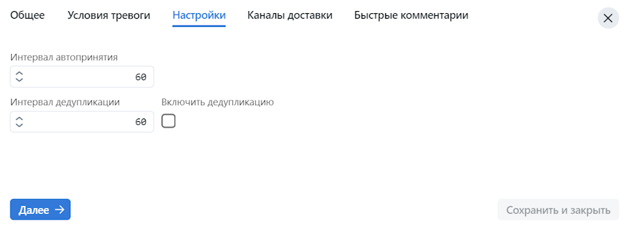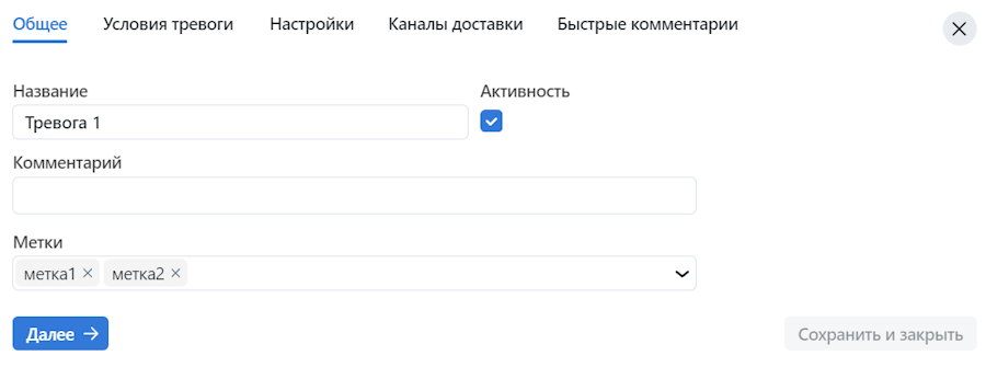 На вкладке Общее введите название тревоги, задайте метки при необходимости. Если требуется активировать тревогу, поставьте галочку Активность. Нажмите Далее, чтобы перейти на вкладку Условия тревоги.