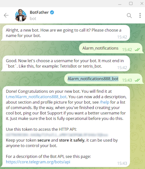 _bot, например,Alarm_notifications888_bot. Допускается использование букв только латинского алфавита.Вы получите сообщение с токеном и ссылкой на чат-бот.