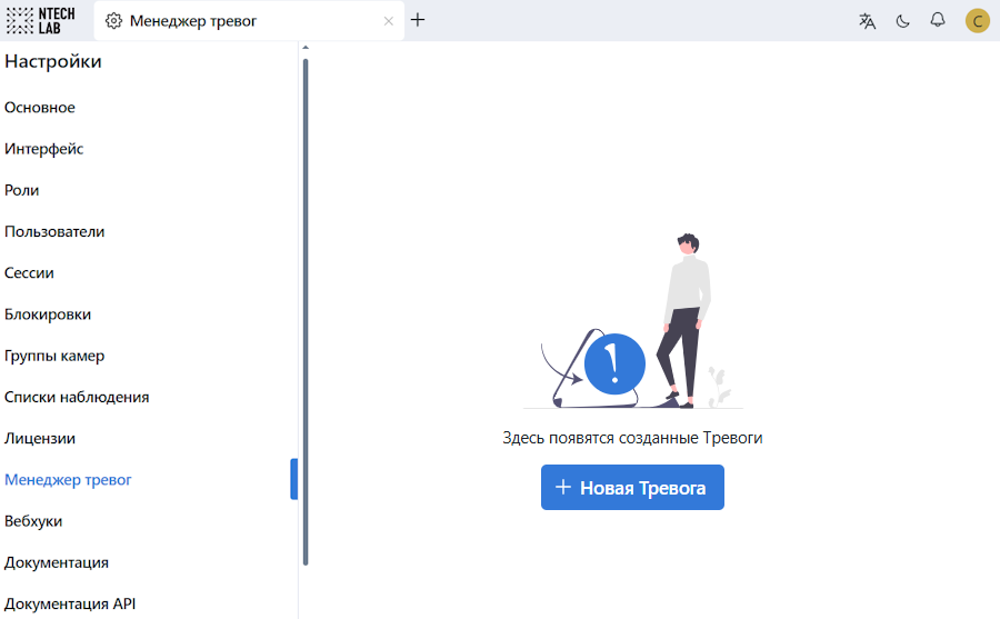 Чтобы начать получать оповещения о тревогах, создайте новую тревогу в Менеджере тревог, т.е., задайте набор условий и настроек, при соответствии которым, система отправит оповещение в выбранные каналы доставки. В FindFace Multi перейдите в Настройки → Менеджер тревог и нажмите + Новая Тревога.