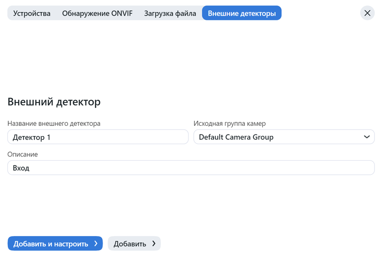 В открывшейся вкладке добавьте внешний детектор в группу камер, чтобы впоследствии было удобнее фильтровать события с данного устройства.