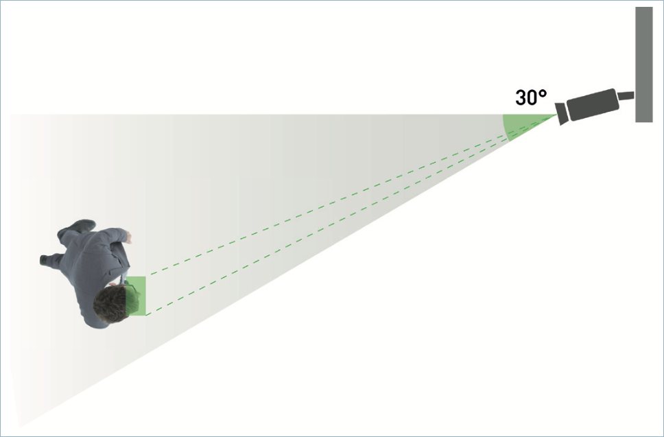 Угол горизонтального отклонения не должен превышать 30°. Горизонтальное отклонение — это отклонение оптической оси видеокамеры от вектора движения основного потока объектов распознавания.