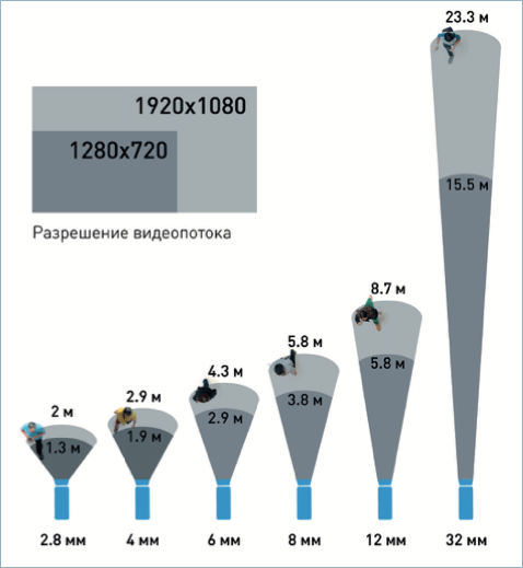 Фокусное расстояние объектива должно выбираться таким образом, чтобы при заданном расстоянии до объектов съемки обеспечивалась необходимая плотность пикселей. На рисунке ниже приведен пример расчета фокусного расстояния объектива от расстояния между камерой и объектами съемки. Для расчета фокусного расстояния для конкретной камеры требуется использовать калькуляторы или методологию, предоставляемые производителем камеры.