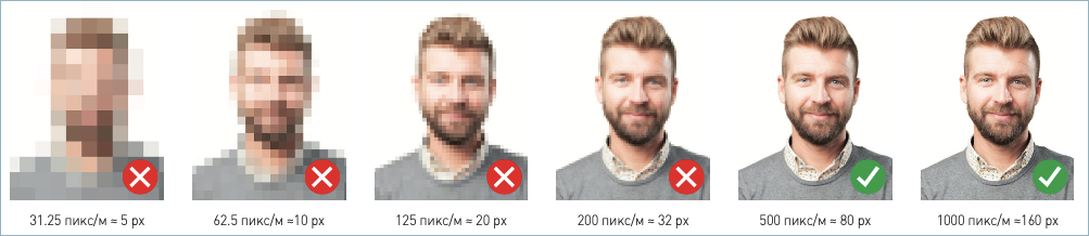 Минимальная плотность пикселей для идентификации – 500 пикселей/м (примерно соответствует ширине лица 80 пикселей).