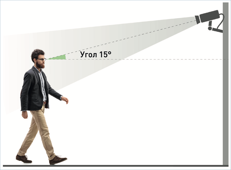 Угол вертикального наклона видеокамеры не должен превышать 15°. Вертикальный наклон — это отклонение оптической оси видеокамеры от горизонтальной плоскости, расположенной на уровне середины лица человека среднего роста (160 см).