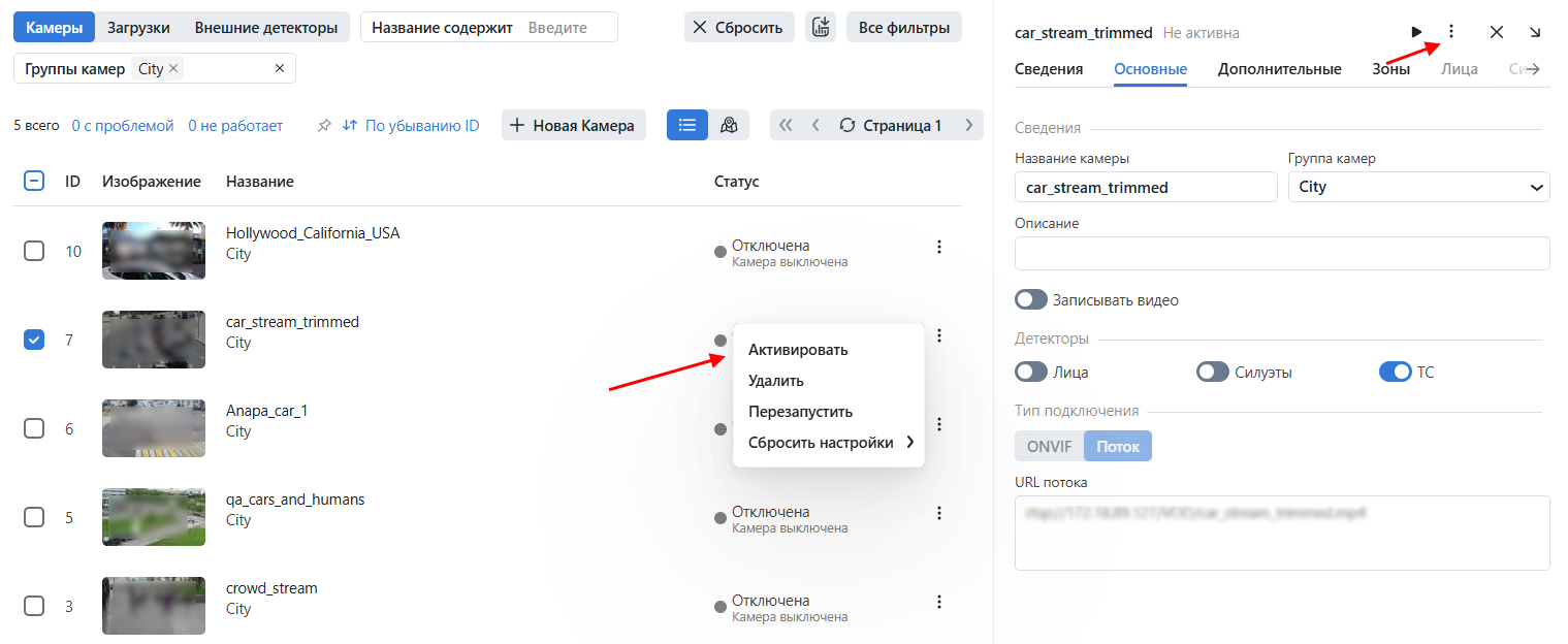 В списке камер или в мастере настройки обработки нажмите три точки → Активировать, чтобы активировать камеру и запустить идентификацию объектов. Убедитесь, что группа камер активна. Вы можете просмотреть события идентификации объектов на вкладках События и Эпизоды, отфильтровав список событий по группе камер/ камере.