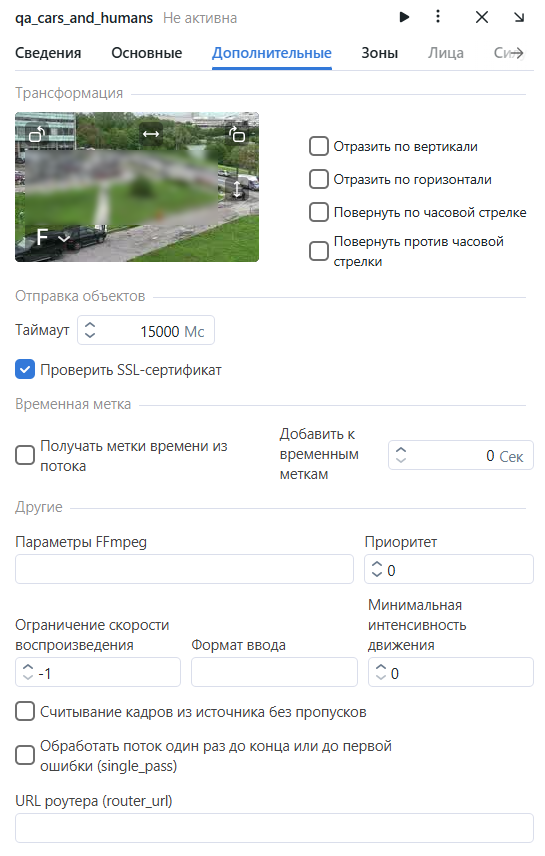 true, то не перезапускать обработку потока при обнаружении ошибки.URL роутера (router_url): IP адрес для отправки обнаруженных объектов во внешние видеообработчики из