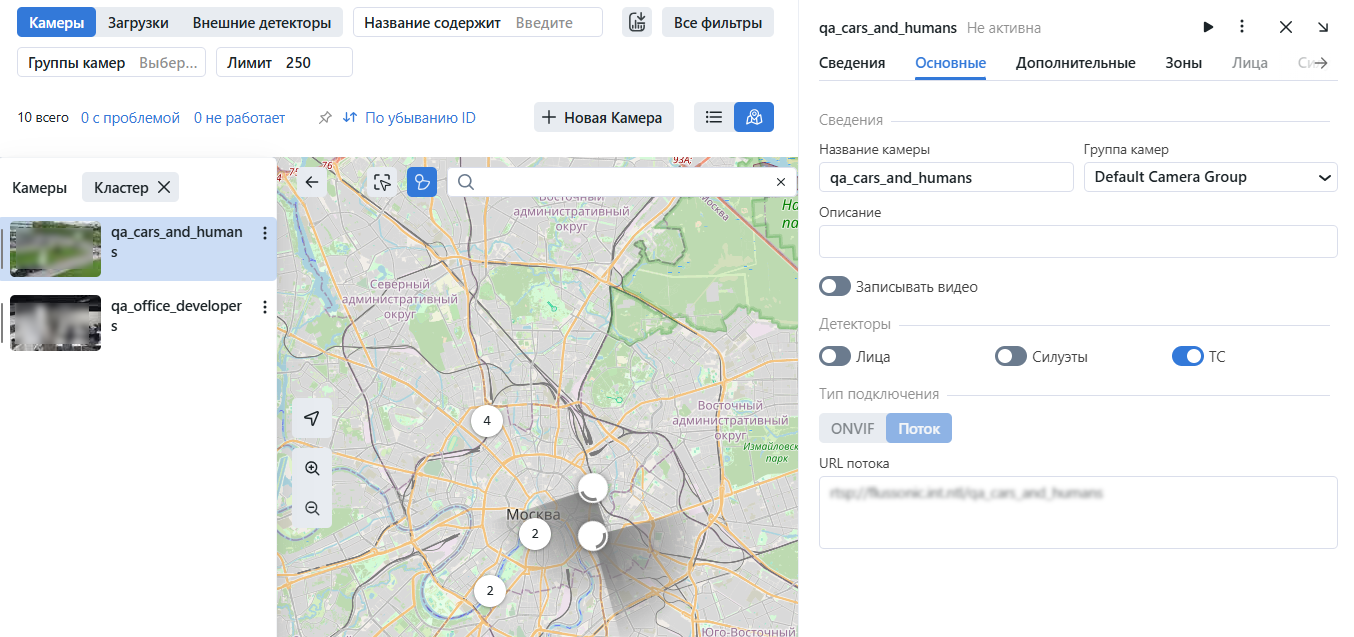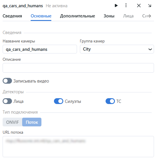 На вкладке Основные вы можете изменить название камеры, группу камер и описание. Вы можете записать видео, если эта опция включена. Поставьте флажки для тех детекторов, которые нужно активировать для данной камеры: лица, силуэты, транспортные средства.
