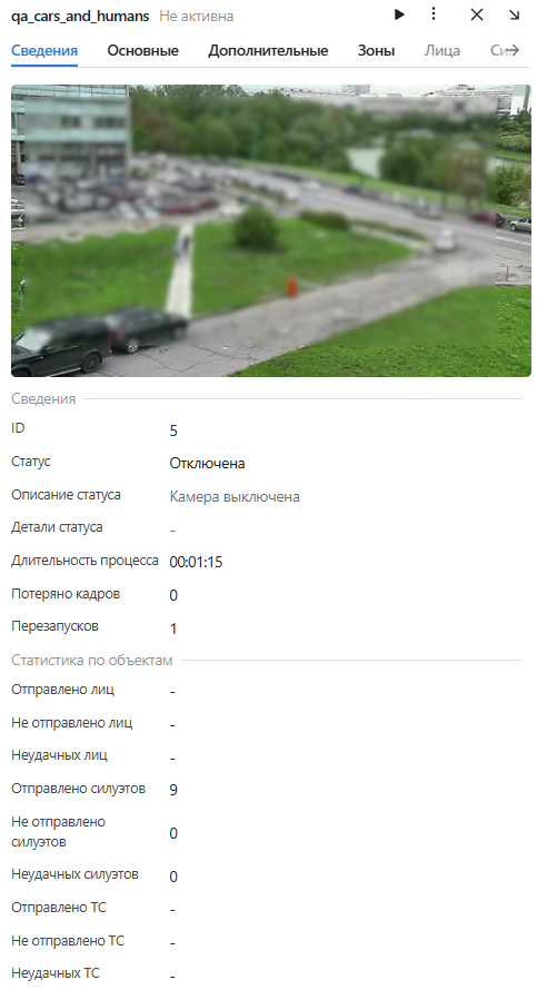 Для каждой камеры предоставляется полная статистика: текущий статус и его описание, продолжительность текущей сессии обработки, количество отправленных объектов, количество объектов, обработанных с ошибками после последнего перезапуска job-задания, количество пропущенных кадров и другие данные. Для просмотра этих данных нажмите на камеру и перейдите на вкладку Сведения.